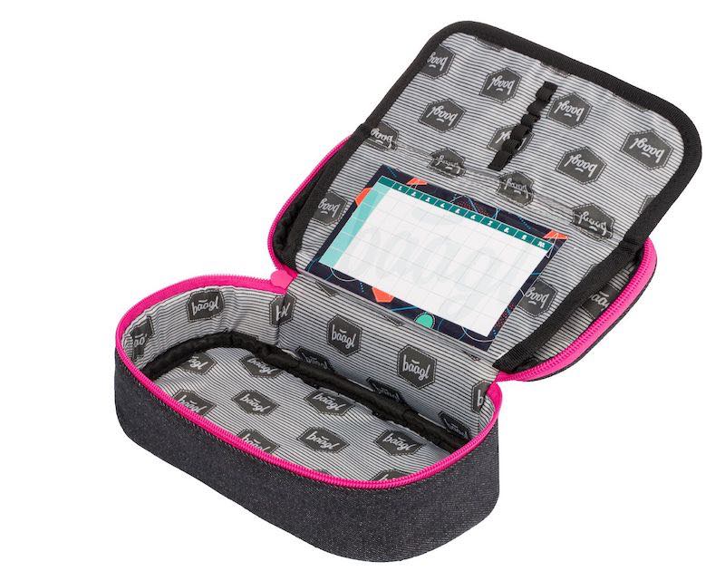 Praktický školní penál je dostatečně velký k uložení všech psacích potřeb a je vhodný pro školáky i pro studenty. Etue má uvnitř výklopnou, dvojitou chlopeň, na které je rozvrh hodin a 18 gumových úchytů pro bezpečné uložení tužek, pera a dalších psacích potřeb. Pod chlopní je prostorná komora, do které se vejdou pastelky i fixy, kružítko, úhloměr, nůžky, lepidlo a další nezbytnosti. Zevnitř na víku je kapsička uzavíratelná na zip, vhodná pro uložení drobných předmětů popř. peněz. Penál etue se uzavírá na zip, který je opatřený taháčkem pro lepší manipulaci. Školní pouzdro není naplněné.