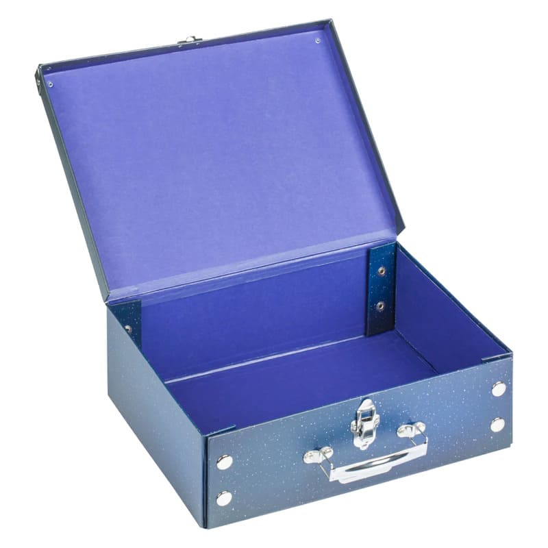 Skládací školní kufřík je vyrobený z pevného laminovaného papíru, má okované rohy, kovové ucho a kovovou přezku na zapínání. Unikátní provedení s patentky umožňuje kufřík opakovaně rozložit a složit. Kufřík do školy je vhodný pro uložení všech výtvarných nebo školních potřeb. Lze také využít pro uložení menších hraček.