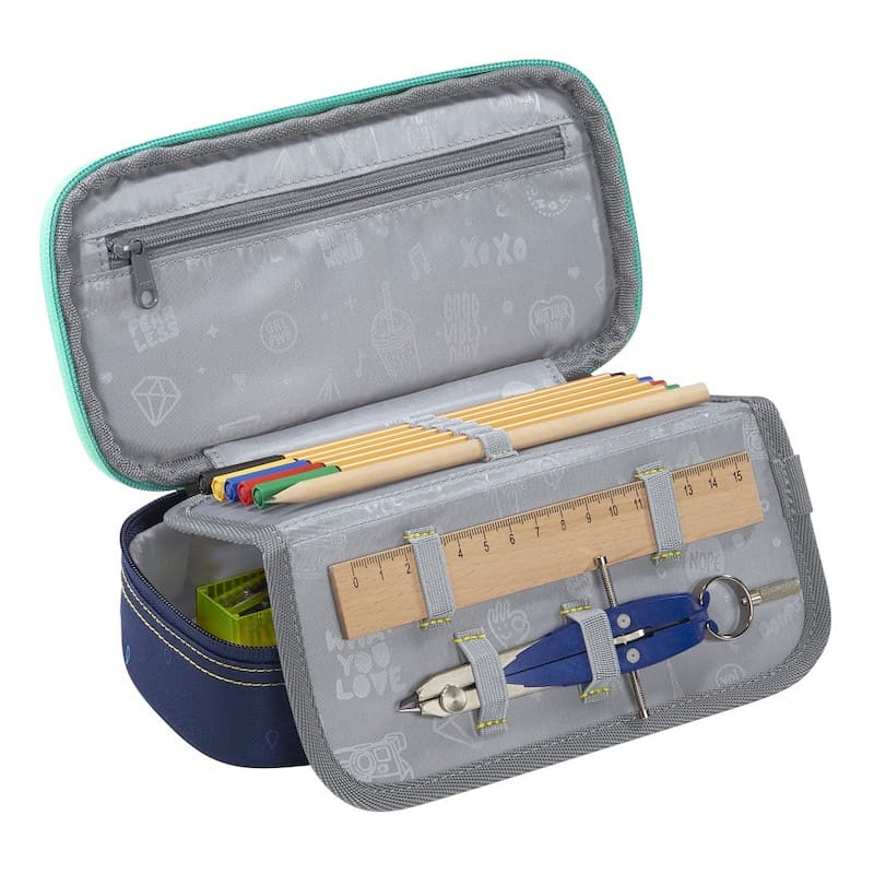Školní penál coocazoo s dvojitou klopou – bez vybavení. Praktický penál etue pro ukládání školních psacích potřeb uzavíratelný na zip. Uvnitř penálu je dvojitá klopa s gumovými poutky, pro uchycení pera, tužky, pastelek nebo fixek, ale také např. kružítka nebo malého pravítka. Vnitřní klopa se dá zavřít na suchý zip. Ve víku penálu je menší kapsa uzavíratelná na zip. Uvnitř etue je dostatečný prostor pro libovolné uložení dalších pomůcek. Tento ekologický penál je vyroben z recyklovaných PET láhví.
