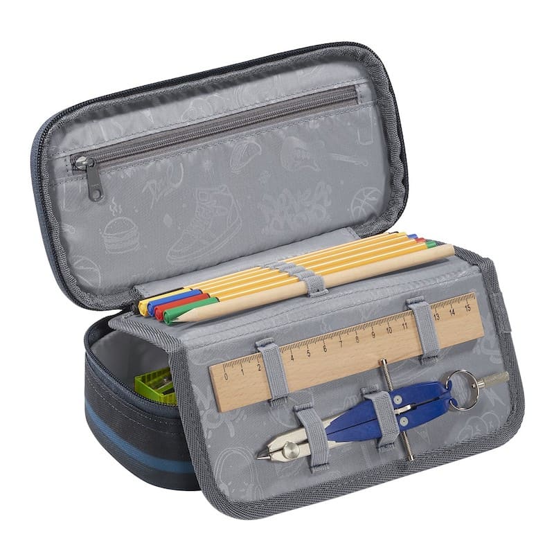 Školní penál coocazoo s dvojitou klopou – bez vybavení. Praktický penál etue pro ukládání školních psacích potřeb uzavíratelný na zip. Uvnitř penálu je dvojitá klopa s gumovými poutky, pro uchycení pera, tužky, pastelek nebo fixek, ale také např. kružítka nebo malého pravítka. Vnitřní klopa se dá zavřít na suchý zip. Ve víku penálu je menší kapsa uzavíratelná na zip. Uvnitř etue je dostatečný prostor pro libovolné uložení dalších pomůcek. Tento ekologický penál je vyroben z recyklovaných PET láhví.