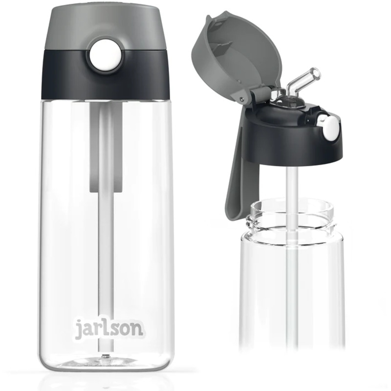 Dětská tritanová láhev na pití JARLSON EMI černá s brčkem a praktickým silikonovým držátkem.