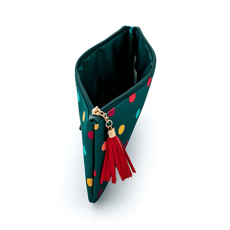 Hledáte tu pravou kosmetickou tašku? Už nemusíte hledat dál. Právě jste ji našli. Tato praktická kosmetická taška má plochý tvar, takže lze pohodlně sbalit do každého zavazadla i kabelky. Toaletní taška má hravý design s puntíky a trendy přívěskem. Kosmetická taštička se uzavírá na zip. Už nemusíte hledat svojí kosmetiku na dně kabelky, v této trendy kosmetické taštičce jí budete mít stále po ruce.