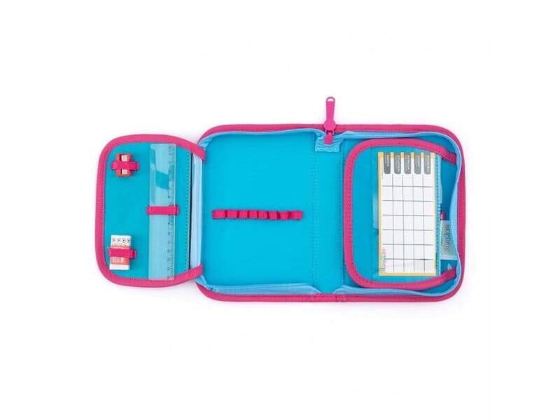 obsahuje pravítko, gumu, ořezávátko, rozvrh hodin a malou násobilku