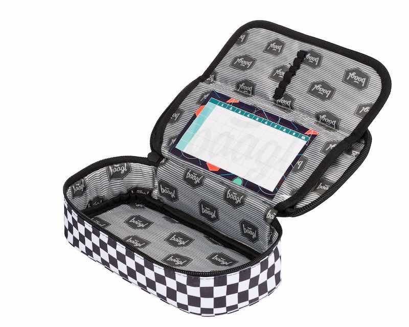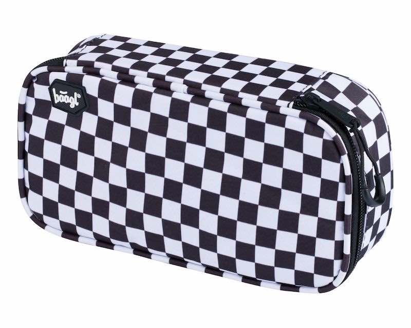 Černobílý pevný penál s dvojitou výklopnou chlopní, uzamykatelný na kvalitní zip.• Pevný školní penál s výklopnou vnitřní přepážkou