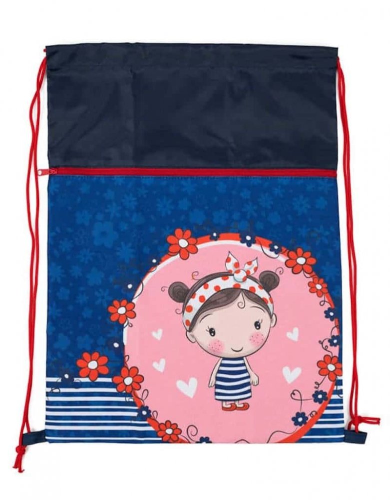 Praktický sáček na přezůvky nebo věci na tělocvik je vyroben z pevného, voděodpudivého materiálu. Hlavní komora se uzavírá na stahovaní na šňůrky, které poté slouží jako ramenní popruhy. Na přední straně je kapsa uzavíratelná na zip. Vak lze použít také na sportovní kroužek nebo jako malý batůžek.